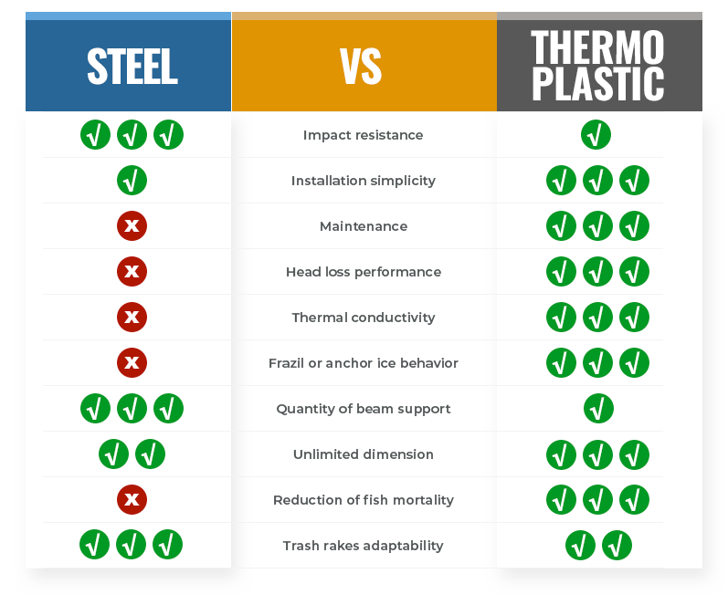 Two types of trash racks exist, STEEL & THERMOPLASTIC.